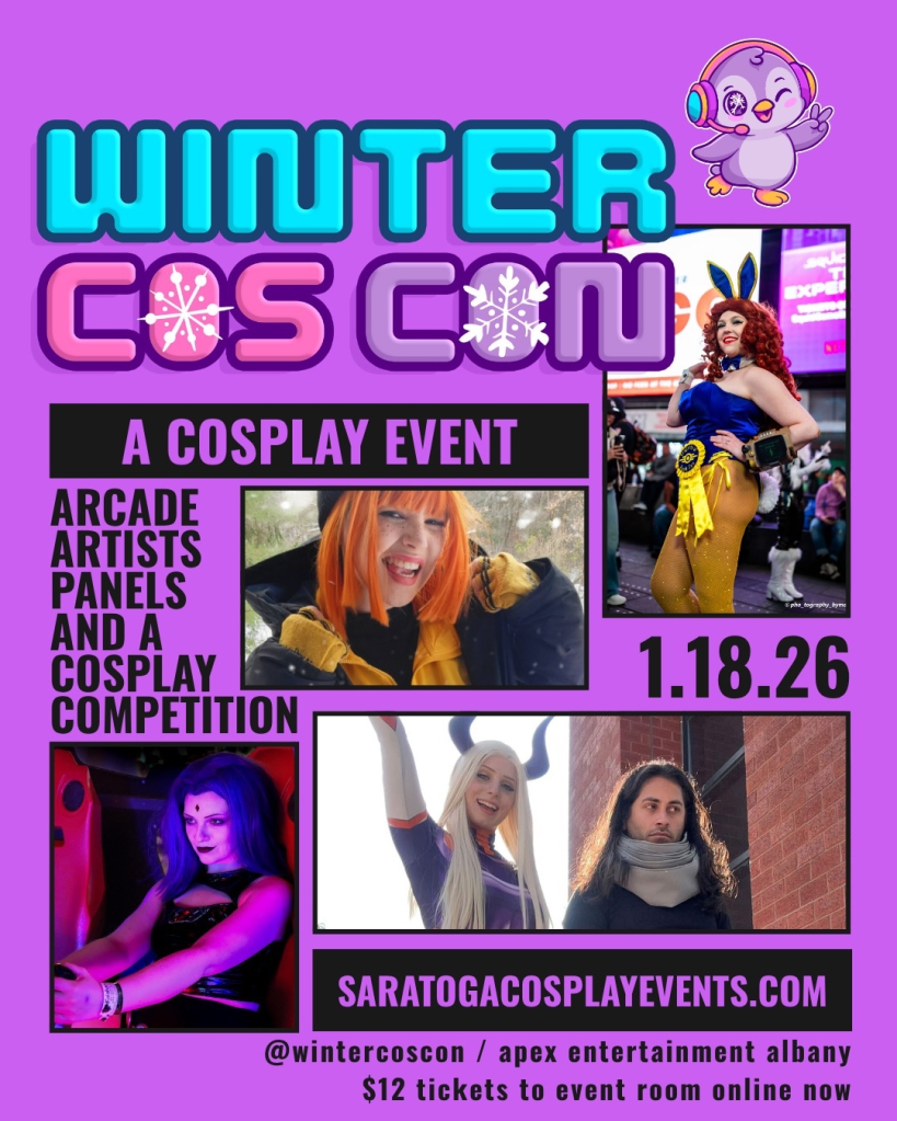 Bundle up and get ready for a day of cosplay, gaming, and community at Winter Cos Con! Join us on Sunday, January 18th, 2026, inside Apex Entertainment at Crossgates in Albany, NY for a cozy mid-winter Cosplay celebration.